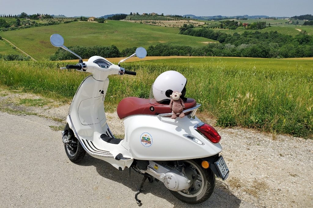 Once ready we were split into groups of about 8, and off we went following our guide, Jason. Most of the roads we were on were fairly quiet country roads, so other traffic wasn’t a big worry, and Jason kept a good eye on us all. We drove a while though the beautiful Tuscan countryside, then stopped at a scenic point to take a break, stretch our legs and take photographs. If you look closely you can see our little traveling monkey, called Mick, sitting on my Vespa. He travels with us and even has his own Instagram page @mickthemonkey.