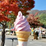 The bus tour continued on, stopping briefly at one spot by Lake Kawaguchi, then continuing on to the area by the lake that was hosting the Autumn Leaves Festival. This festival is held annually, through most of November, and celebrates the Autumn colour, especially the lovely Maple trees in the area. Here we were shown to the small restaurant where we could buy our lunch. I enjoyed a quick tasty bowl of Ramen, and was then able to spend a good amount of time walking beside the lake, catching glimpses of Mt Fuji through the clouds. We could admire the Maple trees, and browse the stalls of the festival. I took the opportunity to enjoy a delicious Grape flavoured ice cream as that area of Japan is known for it’s growing of grapes.