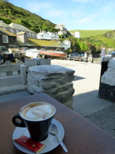 Because the streets are so narrow in Port Isaac, traffic that is allowed down into the harbour area of the village is limited and there is virtually no parking down there. My mum cannot walk very far, so Debbie drove us half way down the steep hill to the harbour, where she dropped us, then drove back up to the car park at the top. My mum and I walked the last hundred yards or so down to the harbour and found a nice restaurant right there called The Mote Bar and Restaurant. They had a pretty little outside seating area overlooking the harbour, so I sat my Mum down and went inside to order us a couple of cappuccinos and wait for Debbie.
