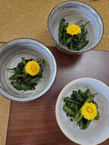 We also worked on a side dish for our meal, Green beans with crushed sesame seeds, decorated with an edible Chrysanthemum flower. It was a very easy, but flavourful dish to make and looked very pretty too!